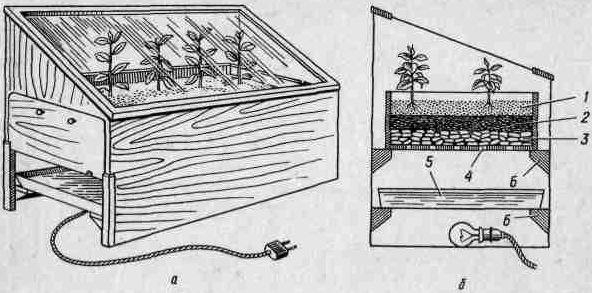 Парниковый тазик должен быть выдвижной, высотой до 5 см, с отверстиями для наполнения водой и для ее спуска. Из тазика наружу выводят изогнутую стеклянную трубку для наблюдения за уровнем воды в нем. Под тазиком, на дне ящика, помещают электролампу, которая нагревает воду в тазике. При нагревании воды почва насыщается парами и нагревается.