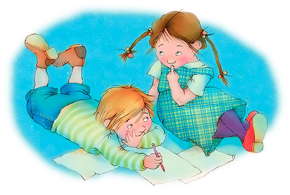 Тут Ваня задумался и поднял глаза к потолку. Леночка заглянула в тетрадку и прочла, что написал Ваня.