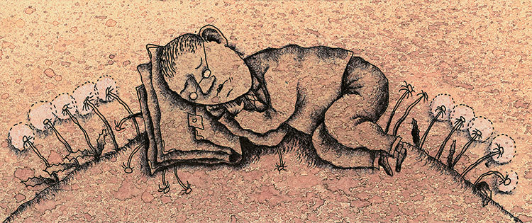 Среди одуванчиков лежит человек. Вокруг него несколько цветков осыпались. Он спит. Ему снится школа. На партах сидят дикие звери. Вон там, на передней парте слева, сидит волк – это самый опасный ученик; он смотрит на учителя жадными глазами.