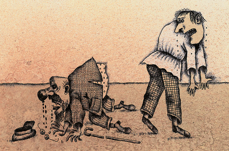 У Колкова заболела рука и он пошел в амбулаторию. По дороге у него заболела и вторая рука. От боли Колков сел на панель и решил дальше никуда не идти. Прохожие проходили мимо Колкова и не обращали на него внимания. Только собака подошла к Колкову, понюхала его и, подняв заднюю лапу, прыснула Колкову в лицо собачьей гадостью. Как бешеный вскочил Колков и со всего маху ударил собаку ногой под живот. С жалобным визгом поползла собака по панели, волоча задние ноги. На Колкова накинулась какая-то дама и, когда Колков попытался оттолкнуть ее, дама вцепилась ему в рукав и начала звать милиционера. Колков не мог больными руками освободиться от дамы и только старался плюнуть ей в лицо.