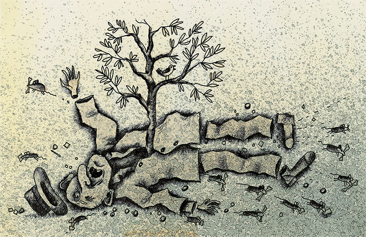 У одного старичка из носа выскочил маленький шарик и упал на землю. Старичок нагнулся, чтобы поднять этот шарик и тут у него из глаза выскочила маленькая палочка и тоже упала на землю. Старичок испугался и, не зная что делать, пошевелил губами. В это время у старичка изо рта выскочил маленький квадратик. Старичок схватил рот рукой, но тут у старичка из рукава выскочила маленькая мышка. Старичку от страха сделалось нехорошо и он, чтобы не упасть, сел на корточки. Но тут в старичке что-то хрустнуло и он как мягкая плюшевая шуба, повалился на землю. Тут у старичка из прорешки выскочил длинненький прутик, и на самом конце этого прутика сидела тоненькая птичка. Старичок хотел крикнуть, но у него одна челюсть зашла за другую, и он, вместо того, чтобы крикнуть, только слабо икнул и закрыл один глаз. Другой глаз у старичка остался открытым и перестав двигаться и блестеть, стал неподвижным и мутным, как у мертвого человека. Так настигла коварная смерть старичка, не знавшего своего часа.