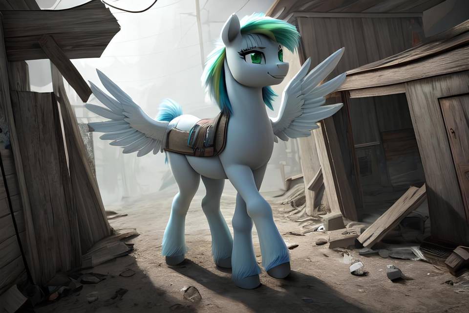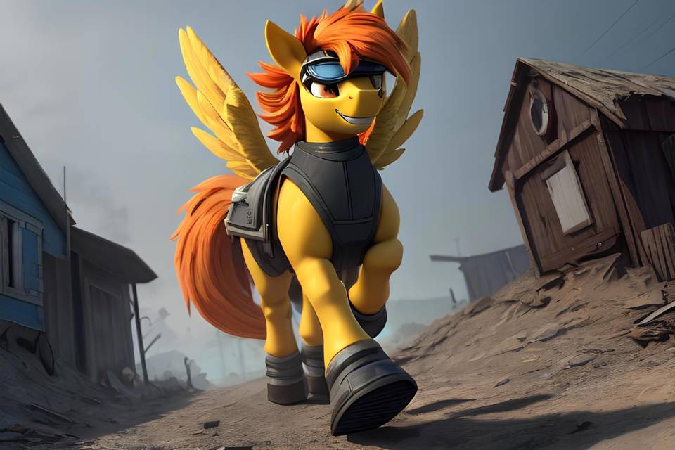 У Стрим Дэш, кстати, настоящее имя было Стрим Даст, и даже вроде она являлась потомком Лайтнинг Даст – генерала, которая, по рассказам, двести лет назад и основала Анклав. Но пегаске всегда претили устои жизни над облаками – и вот однажды ночью она перекрасила зелёную гриву под стиль легендарной Рэйнбоу Дэш, взяла из арсенала оружие, а из казарм – своего кольтфренда, которого окружающее тоже начало подбешивать. И они вдвоём спустились в Пустошь, где смогли успешно затеряться от бдительного ока Анклава.