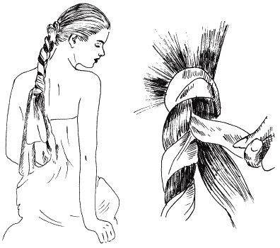 2. Соберите волосы на затылке, разделите их на несколько прядей и переплетите с концами шарфа наподобие косы.