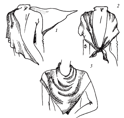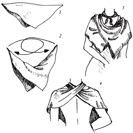 1. Сложите квадратный платок по диагонали так, чтобы верхнее полотнище было немного меньше нижнего. Загните вверх нижний угол платка и сверните его в узкий шарф с треугольными концами.