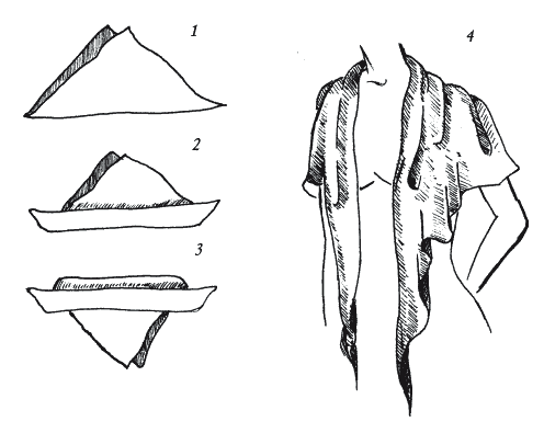 1. Сложите платок по диагонали таким образом, чтобы верхнее полотнище было немногим больше нижнего.
