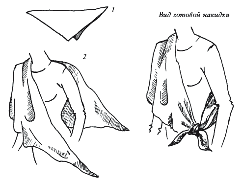 1. Сложите платок по диагонали пополам, накиньте на плечи и завяжите его концы простым узлом.