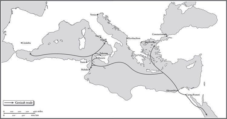 Мир Генизы простирался до западных краев известного мира. Хотя Аль-Андалус, мусульманская Испания, не был основным центром бизнеса, который вели купцы Генизы, сохранилось множество упоминаний о коллегах, которые происходили из Испании. Некоторые из них, получившие ярлыки аль-Андалуси или ха-Сефарди, "испанец", перемещались по всему Средиземноморью, как, например, семья Якова аль-Андалуси, которая в середине XI века жила на Сицилии, в Тунисе и Египте.15 Великий купец Халфон бен Нетанель был в Испании в 1128-30 годах, затем в Индии между 1132 и 1134 годами, а в 1138-9 годах вернулся в Аль-Андалус.16 Сицилия была одним из центров сети Генизы. Когда в IX веке она была завоевана мусульманами, первым городом, павшим перед захватчиками, стала Мазара на западе острова. Он стал крупным терминалом для морских перевозок из Египта, и небольшие лодки переправляли товары из Махдии и других тунисских портов; после прибытия в Мазару товары перегружались на более крупные суда для отправки на восток. Некоторые из кораблей, курсировавших между Андалусом, Сицилией и Египтом, были большими; около 1050 года десять больших кораблей, каждый из которых перевозил около 500 пассажиров, прибыли в Палермо из Александрии. В Мазаре находился знаменитый рынок египетского льна, и торговцы в Египте с нетерпением ждали новостей о ценах на лен, чтобы знать, сколько льна следует отправить на запад. В другом направлении путешествовал шелк, который широко использовался в туалетах египетских невест, а также множество других тонких тканей: подушки, покрывала, ковры и предмет под названием мандиль, или мантилья, для покрытия волос невесты.17 На Сицилии были большие пастбища, поэтому неудивительно, что качественная кожа, иногда позолоченная, и овечий сыр были одними из самых ценных товаров, экспортируемых с острова.18 Сыр везли вплоть до Египта, хотя некоторые из них были молодыми и свежими.