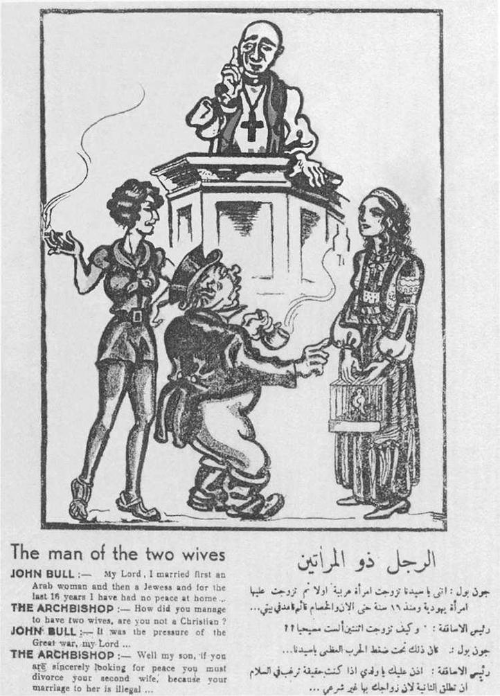 О недоумении яффцев по поводу поведения их еврейских соседей даже в менее напряженные времена можно судить по карикатуре из арабской газеты "Фаластин" за 1936 год (напротив). Англиканский архиепископ стоит на кафедре и наставляет располневшего Джона Булла, у которого две жены: первая – скромная палестинская арабка, лицо и волосы которой открыты, но она одета в традиционную палестинскую одежду и носит клетку с голубем; вторая – длинноногая еврейская пионерка в очень коротких шортах и обтягивающей блузке, курящая сигарету. Джон Булл объясняет, что давление Великой войны заставило его жениться дважды, и архиепископ настаивает на том, чтобы он развелся со своей женой-еврейкой. Политический посыл очевиден, но также и смесь восхищения и беспокойства по поводу манер новых еврейских поселенцев.38 Непринужденное знакомство между евреями и арабами в те дни, когда Челуши основали Неве-Цедек, исчезло. Те, кто строил Тель-Авив, стали слишком настойчиво подчеркивать разницу между тем, что они хотели создать, и тем, что они оставили в Яффо. Простые модернизаторы, основавшие Неве-Цедек, были поглощены иммигрантами, для которых пути Востока были совершенно чужды. Подобные изменения естественным образом вытекали из давления, которое оказывали на Тель-Авив тысячи новоприбывших, спасавшихся от преследований в центральной и восточной Европе. В то же время некоторые сионистские лидеры превозносили преимущества создания еврейского города – первого полностью еврейского города, как они утверждали, за 1900 лет. По иронии судьбы, как раз в это время волны преследований в Европе достигли новой и беспрецедентной интенсивности, опустошая восточноевропейские города, где евреи составляли почти или реально большинство. Одним из таких городов была Салоника.