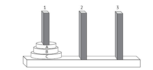 Рис. 1.7. На рисунке изображена игровая доска с тремя столбиками. На левый столбик надеты три увеличивающихся в диаметре кольца. Задача заключается в том, чтобы переместить все три кольца с левого столбика на правый. Перемещение колец осуществляется согласно двум правилам: за один раз вы можете взять только одно из них и вы не имеете права помещать кольцо большего диаметра на кольцо меньших размеров
