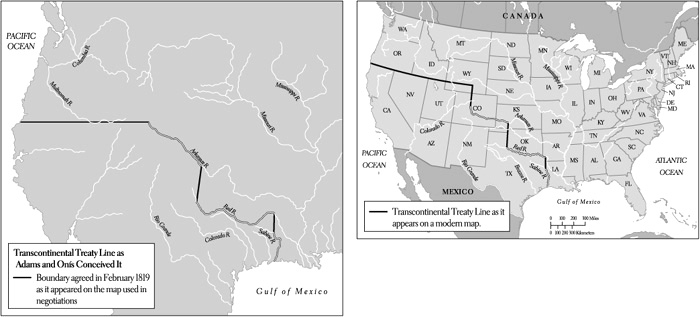 22 февраля 1819 года, в день рождения Джорджа Вашингтона, Адамс осуществил свою мечту, подписав одно из самых значительных достижений американской дипломатии – Вашингтонский трансконтинентальный договор. По условиям договора Испания не только признавала ранее захваченные американцами куски Западной Флориды, но и уступала Соединенным Штатам все остальные Флориды. Луизианская покупка была признана, а её западная граница установлена по рекам Сабин, Ред и Арканзас, а затем на север до 42-й параллели широты. Адамс упорно настаивал на том, чтобы границей служили западные берега, а не центры этих рек, чтобы монополизировать их для американской торговли. 42-я параллель была определена как граница Альта Калифорнии. К северу от этой линии Испания отказывалась от всех своих претензий в пользу Соединенных Штатов. Вдобавок к соглашению о совместной оккупации Орегона, недавно заключенному с Великобританией, этот Трансконтинентальный договор стал ещё одним большим шагом на пути превращения Соединенных Штатов в державу двух океанов. (Карты, с которыми велись переговоры, были неточными, поэтому линии, нанесенные на них, выглядели не так, как на современной карте). «Почти в час ночи, – записал Адамс в своём монументальном дневнике, – я завершил день словами горячей благодарности Дарителю всех благ… Признание определенной линии границы Южного моря составляет великую эпоху в нашей истории».[259]259