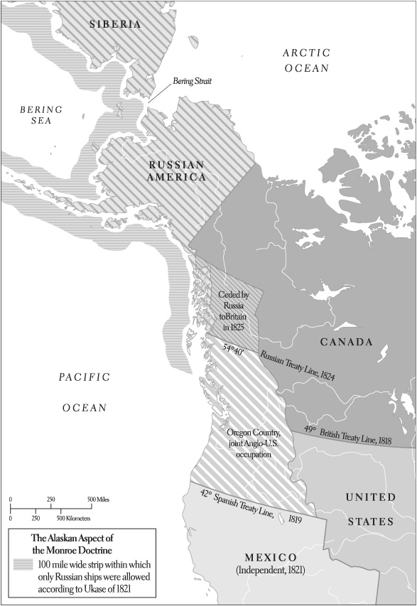 Тем временем возникла другая угроза американским интересам, также связанная с царем. На тихоокеанском северо-западе Россия расширяла свои притязания от Аляски до Орегона. В 1821 году царь Александр I издал указ, предупреждающий иностранные суда не приближаться ближе чем на сто миль к побережью Русской Америки, как тогда называлась Аляска, к северу от 51-й параллели широты. Это одностороннее утверждение морской монополии показало, что русские были серьёзными конкурентами в торговле пушниной и намеревались расширить своё влияние на тихоокеанском северо-западе. И Соединенные Штаты, и Великобритания были намерены противостоять этому указу. Однако из-за их соперничества друг с другом англичанам и американцам пришлось иметь дело с русскими по отдельности.[268]268