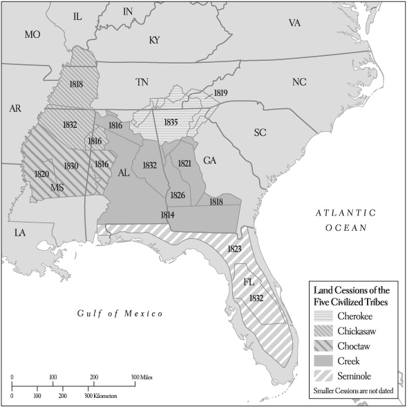 Первые европейцы, вторгшиеся на территорию, ставшую впоследствии юго-восточной частью США, столкнулись с процветающим народом чероки, проживавшим на обширной территории южных Аппалачей. Как и многие другие коренные американцы, чероки встали на сторону британцев во время Революционной войны, понимая, что имперские власти хотят торговать, а белые поселенцы – получить их землю. Через четыре года после того, как их британские союзники капитулировали при Йорктауне, чероки тоже признали своё поражение в Хоупвеллском договоре, Южная Каролина (1785). По его условиям, чероки уступили большую часть своей привычной территории. Оставшаяся часть впервые обрела четкие границы, которые были ещё более ограничены договорами после того, как Теннесси стал штатом. В течение десятилетия продолжались спорадические несанкционированные набеги и репрессии с обеих сторон, но племя чероки больше никогда не вступало в войну с Соединенными Штатами. Более того, племя заключило союз с Эндрю Джексоном против своих старых врагов – криков и сыграло важную роль в его победе при Подковообразном изгибе в 1814 году. Праздновавшаяся в то время как триумф, в долгосрочной перспективе эта кампания против криков, возможно, была ошибкой, поскольку исключала любую возможность межплеменного коллективного сопротивления. Добрая воля Джексона, которую, как считали чероки, они заслужили, оказалась недолговечной; по договору в Форт-Джексоне он добился уступки земель не только от криков, но и от своих союзников чероки. (Готовность Кроуфорда, бывшего в то время военным секретарем Мэдисона, выплатить чероки компенсацию за эти земли поначалу вызвала давнюю неприязнь между ним и Джексоном).[818]818