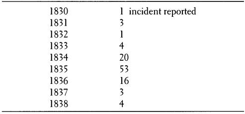 Источник: Леонард Ричардс, «Джентльмены собственности и положения» (Нью-Йорк, 1970), 12. Реестр Найлса не пытался охватить все беспорядки, и реальное количество инцидентов было, возможно, в три раза больше, но приведенные выше цифры дают представление о восприятии общественностью и относительной частоте.