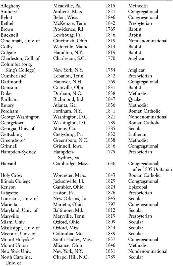 [Закрыть] Поскольку в большинстве случаев конфессиональная принадлежность не имела большого значения для учебной программы колледжа, в студенческие группы обычно входили молодые люди из разных конфессий. Эти многочисленные маленькие колледжи служили целям своих местных общин, а не только своим конкретным сектам. Но они существовали на грани финансовой жизнеспособности и часто подвергались тем же экономическим спадам, что и бизнес и финансовые предприятия.[1098]1098