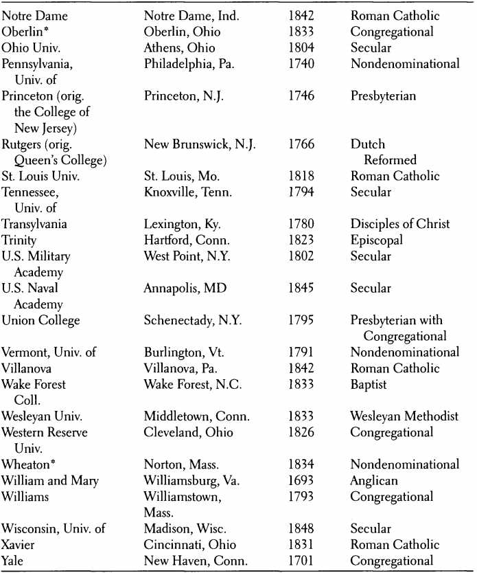 Учебные заведения, отмеченные звездочкой, принимали женщин до 1848 года. Некоторые учебные заведения, начинавшиеся как колледжи, впоследствии стали университетами.