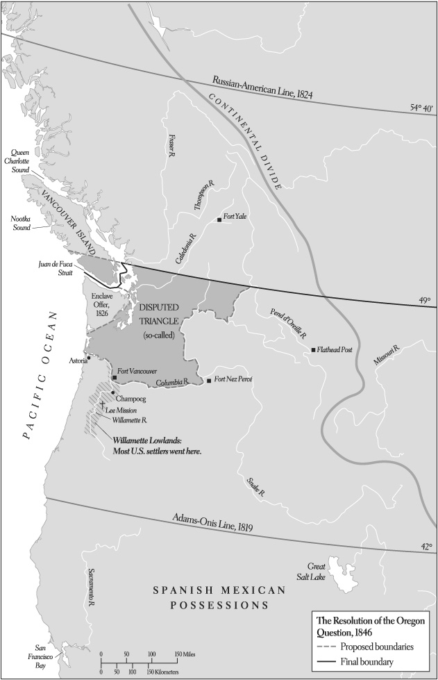 [Закрыть] В ответ 19 мая британцы предложили 49-ю параллель с обходом, чтобы сохранить южную оконечность острова Ванкувер (где, конечно же, компания Гудзонова залива построила форт Виктория). Они уступили им всю остальную часть спорного треугольника, хотя в нём на тот момент не насчитывалось и двух десятков американцев.[1707]1707