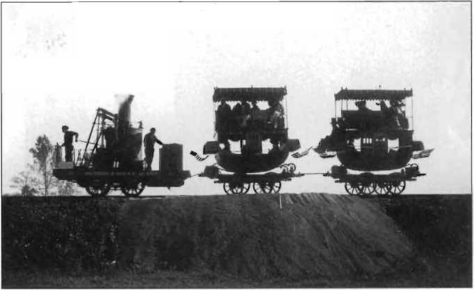 Первые железнодорожные вагоны иногда напоминали дилижансы, так же как первые автомобили были похожи на конные повозки. Этот локомотив и два пассажирских вагона работали на железной дороге Балтимор и Огайо в 1832 году. Библиотека Конгресса США.