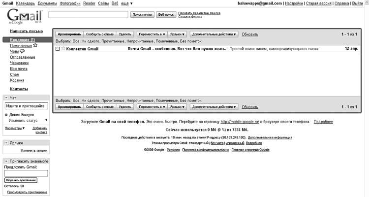 Революционная (приготовьтесь, что это слово на страницах книги будет употребляться еще не раз) почтовая служба Gmail увидела свет 1 апреля 2004 г. Несмотря на праздничную атмосферу дня смеха, новая почта шуткой не была, однако в ее возможности поначалу действительно было трудно поверить: работа только через веб-интерфейс, отсутствие папок, какие-то непонятные «звездочки», ярлыки и… целый гигабайт дискового пространства для хранения почты! Для теперь уже далекого 2004-го такой объем был немыслимым – шутка ли, самые щедрые предложения других бесплатных сервисов не превышали 100 мегабайт! Все, что превосходило лимит, необходимо было немедленно удалять с сервера. А Gmail уже на своей заглавной странице предлагал отказаться от удаления писем, и в его интерфейсе поначалу вообще отсутствовала кнопка «Удалить». Ее добавили спустя некоторое время «по просьбам трудящихся». А спустя год после запуска сервиса планку максимального объема для хранения писем подняли еще раз, и с тех пор она больше не останавливается – счетчик доступного пользователю места крутится, не останавливаясь ни на секунду, и сейчас пользователям Gmail доступно что-то около восьми гигабайт. Но начнем с самого начала. Перед нами – главная страница почтовой службы (рис. 1.5).