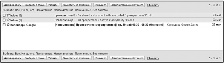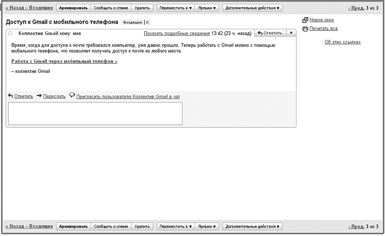 Первое, на что следует обратить внимание, – список сообщений. Посмотрите на заголовок любого из них, и вы заметите, что кроме собственно темы письма там есть еще и короткий фрагмент самого сообщения. Очень удобно кроме формального «Привет!» в заголовке увидеть заветное продолжение: «Не мог бы ты одолжить мне немного дене…» – и, не читая дальше, отправить письмо в корзину.