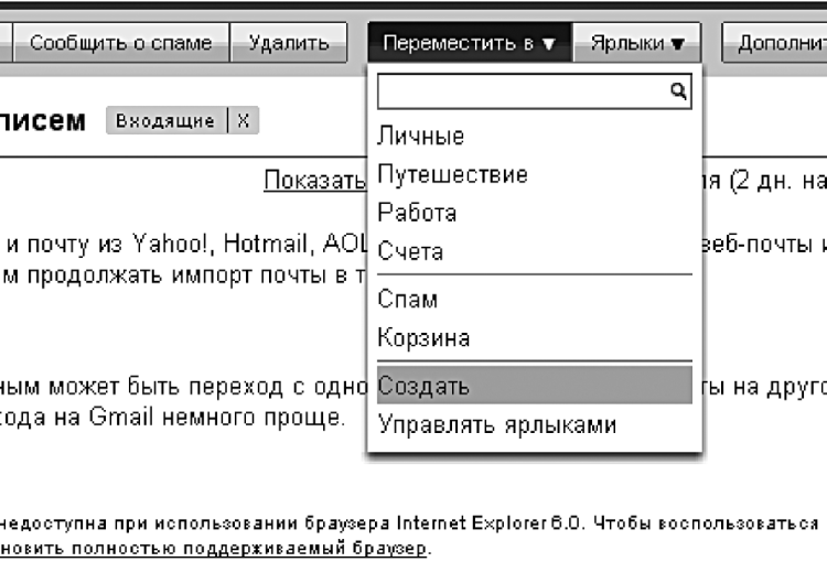 Пункт «Переместить в» позволяет взять письмо из раздела «Входящие» и назначить ему определенный ярлык, при этом само сообщение из «Входящих» пропадет. Но… хотите сказать, у вас еще нет ярлыков? Ошибаетесь! Для вашего удобства новая почта уже содержит несколько меток: «Личные», «Путешествие», «Работа», «Счета». Но давайте создадим еще один, собственный. Как раз читаете письмо с новыми заданиями от шефа? Давайте присвоим этому сообщению ярлык «Босс»! (Оригиналы могут поупражняться в остроумии, давая метке любимые прозвища руководителей.) Смотрите, как просто: выбираем пункт меню «Переместить в – Создать» (рис. 1.8).