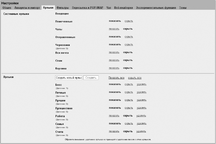 Вся мощь ярлыков проявляется, когда их у нас становится несколько. Давайте создадим нужный нам набор, перейдя в пункт «Настройки – Ярлыки»: он отвечает за создание, переименование и удаление меток. Вы, наверное, уже заметили, что некоторые ярлыки и разделы в основном экране скрыты за выпадающим меню «еще…»? Так вот, именно здесь можно настроить показ или скрытие тех или иных ярлыков и разделов (в настройках они называются «системные ярлыки») (рис. 1.10).