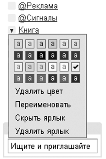 Наводим красоту: ярлыки можно сделать разноцветными! Для этого щелкните на небольшом светло-зеленом квадрате справа от ярлыка. Из предложенной палитры выберите понравившийся вам вариант раскраски текста или фона: критически важные метки можно окрасить в оттенки красного, тогда как для рутинных тем стоит выбрать нейтральные цвета, чтобы взгляд при просмотре списка писем выделял главное. Из того же меню можно скрыть ярлык или удалить его (рис. 1.12).