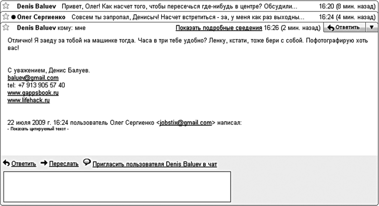 Однако вернемся к нашему списку сообщений. Редкая переписка ограничивается одним письмом – общение по электронной почте предполагает диалог, а не монолог. Если все сообщения в почтовом ящике отсортированы по дням их поступления, нить беседы становится сложно поддерживать при сколь-нибудь значительном объеме переписки. Но только не в Gmail – он автоматически группирует сообщения по темам, создавая так называемые цепочки писем. В одном месте вы видите всю историю переписки с тем или иным адресатом. Вот так выглядит типичная цепочка на главном экране (рис. 1.13):