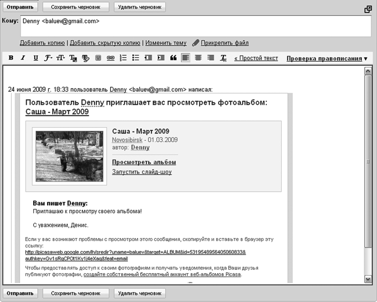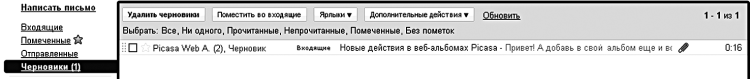 Если в ходе написания важного письма в доме выключили свет или любимая кошка прошлась по клавиатуре, закрыв окно браузера, – не печальтесь, ваши труды не пропали напрасно. Через несколько секунд после того, как вы начали редактировать текст, само письмо попало в папку «Черновики» и с этого момента будет доступно оттуда до той поры, пока вы сами не решитесь его отправить или, наоборот, удалить (рис. 1.19).