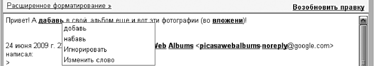 Рисунок 1.18. Щелчок левой кнопкой мыши вызывает меню с подсказкой правильных вариантов и возможностью немедленно исправить ошибку (команда «Изменить слово»). Для возврата к редактированию нажмите на ссылку «Возобновить правку»