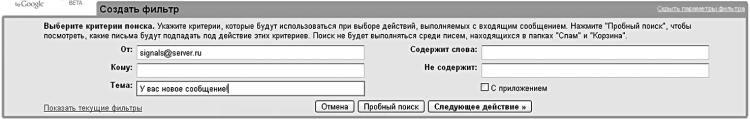 2. Расставьте приоритеты. Важные письма от деловых партнеров или родных, конечно, требуют быстрого ответа. А вот забавные истории из жизни, уведомления о новых оценках ваших фотографий из Турции, которые вы вчера разместили в «Одноклассниках», точно подождут до вечера. Возможно, некоторым из них не стоит даже попадать во «Входящие» – достаточно просто присвоить таким письмам соответствующий ярлык и положить в архив для последующего просмотра. Хорошая идея? Давайте я покажу, как это сделать. Практически в любой продвинутой почтовой программе есть фильтры. Не стал исключением и Gmail – фильтрация писем здесь осуществляется очень просто. Создайте новый ярлык под названием «Уведомления» – его мы будем давать всем сообщениям тех многочисленных социальных сетей, в которых вы зарегистрированы: «Одноклассники», «В контакте», «Мой круг» и т. д. Создали? Вверху экрана, справа от кнопок «Поиск почты» и «Веб-поиск», притаился небольшой пункт «Создать фильтр». В его критериях поиска доступны пять полей. По порядку: адрес отправителя, адрес получателя, тема письма, наличие слов в тексте, отсутствие определенных слов в тексте (операция, обратная предыдущей), а также проверка на наличие вложений. Давайте отфильтруем все уведомления о новых друзьях, поступающих с адреса signals@service.ru, у которых в поле «Тема» написано «У вас новое сообщение!» (рис. 1.21).