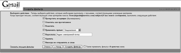 Затем нужно решить, что делать с письмами, которые подходят под выбранные нами параметры. Поставим галочку напротив опции «Пропустить входящие» – подобные уведомления не настолько важны, чтобы отвлекать наше внимание. После этого поставим флажок напротив опции «Применить ярлык» и выберем подходящую метку. Назначьте фильтруемым письмам ярлык «Уведомления», после чего нажмите кнопку «Создать фильтр» (рис. 1.22).