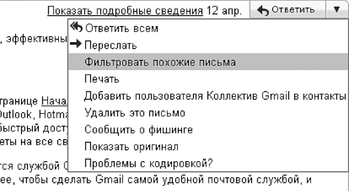Существует очень быстрый способ создания фильтров на базе уже имеющихся у вас писем. Открыв любое сообщение, отправителя которого вы хотите отфильтровать, выберите пункт «Дополнительные действия – Фильтровать похожие письма». В ответ на это Gmail выведет на экран форму параметров фильтрации с уже заполненным полем «От:» – там будет стоять адрес автора выбранного письма. Все, что нужно будет сделать после этого, – ввести дополнительные уточняющие параметры (например, установить флажок «Содержит прикрепленные файлы» для того, чтобы выбрать только письма с вложениями), а затем определить действия, которые будет выполнять фильтр, – применять тот или иной ярлык, помечать звездочкой или отправлять прямиком в корзину (рис. 1.23). Поверьте, это самый быстрый способ создать фильтр – для него требуется всего шесть щелчков мышкой, и никакой клавиатуры! Я проверял.