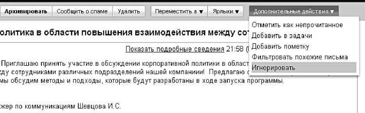 Еще немного об экономии времени. Случалось ли, что вы принимали участие в затянувшейся переписке по какому-нибудь очень нудному вопросу, где лично вам все уже давно понятно? Что-то вроде обсуждения предстоящего выезда на природу, когда дискуссия о списке участников идет уже по двадцать пятому кругу?! Заносить такие письма в спам – не выход: остальные сообщения от этих милых людей вполне приемлемы. Вам просто не хочется больше читать именно это обсуждение. Создать фильтр и отправлять все письма с темой «Пикник» в корзину? Тоже вариант, но есть способ проще. Нажмите на кнопку «Дополнительные действия», расположенную над списком писем. В открывшемся меню выберите опцию «Игнорировать». Она делает именно то, что обещает, – «приглушает» конкретную цепочку сообщений только для вас, отправляя письма по надоевшей теме сразу в архив. Чтобы вернуть цепочку к жизни (в конце концов, все должно быть обратимо!) достаточно найти ее в разделе «Вся почта», после чего нажать кнопку «Поместить во входящие» (рис. 1.25).