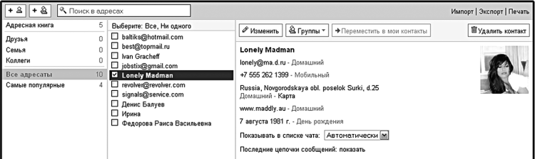 Зайдите в адресную книгу. Окно менеджера разделено на три части. Слева – группы контактов, посередине – электронные адреса, справа – подробная информация об адресатах (рис. 1.26).