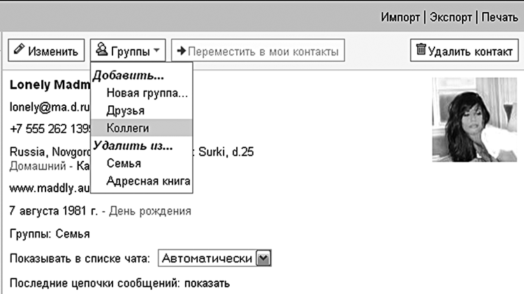 Группы очень похожи на ярлыки – один и тот же контакт может принадлежать сразу нескольким группам. Для этого нужно щелкнуть по кнопке «Группа» и выбрать нужную для добавления или удаления (рис. 1.27).