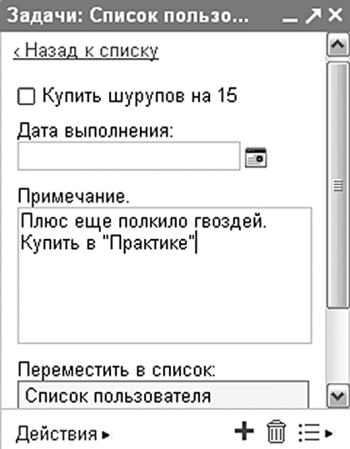 Щелкните по небольшой стрелке, напоминающей математический знак «больше», справа от любого дела – так устанавливаются его дополнительные параметры. Если задача нуждается в пояснении (например, простая формулировка «купить шурупов» явно нуждается в уточнении – где именно купить, какого размера шурупы, нужны ли еще и гвозди), то его явно стоит вынести в поле «Примечание». Если задача имеет четкую дату выполнения или некий крайний срок, то в вашем распоряжении поле «Дата выполнения» (рис. 1.29).