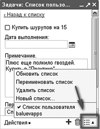 Поле «Переименовать в список» позволяет переносить задачу с одного на другой список дел. Их может быть несколько, и они создаются, переименовываются и удаляются с помощью небольшой иконки в правом нижнем углу окна (рис. 1.30).