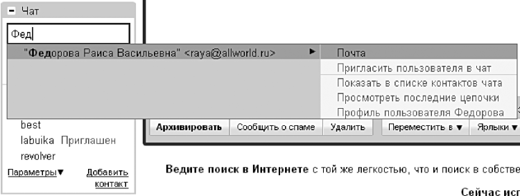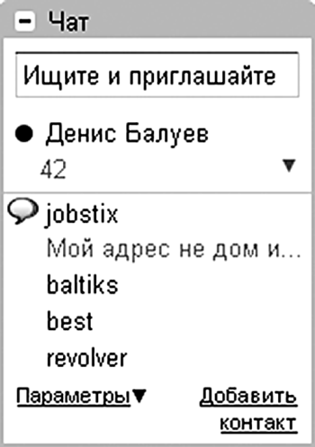 Иногда обыкновенной почты становится недостаточно – для быстрого решения вопроса обмен электронными посланиями все же происходит слишком медленно. На помощь приходит один из важных компонентов Gmail под названием чат. Чат Gmail – способ быстро обсудить место встречи перед дружеским футбольным матчем или задать короткий вопрос, требующий немедленного ответа. Общаться между собой могут как пользователи Gmail, так и любой интернет-пользователь, программа обмена мгновенными сообщениями которого поддерживает протокол Jabber. Кроме того, присутствует и возможность общения с владельцами самой популярной в нашей стране системы обмена мгновенными сообщениями – ICQ. Для того чтобы начать общаться с человеком при помощи чата, необходимо выбрать его имя из списка контактов – он находится прямо под набором ярлыков. Изначально туда попадают те, с кем вы достаточно часто ведете переписку с помощью обычной «электронки». Остальных же можно пригласить пообщаться, введя электронный адрес в поле поиска «Ищите и приглашайте» (рис. 1.31).