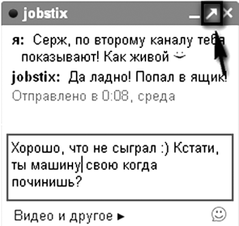 Имею чат – готов общаться! Двойной щелчок на имени пользователя в контактном листе вызовет появление в правом нижнем углу экрана небольшого окошка, которое можно распахнуть на все пространство экрана в отдельном окне или вкладке, если нажать на диагональную стрелку (рис. 1.33).