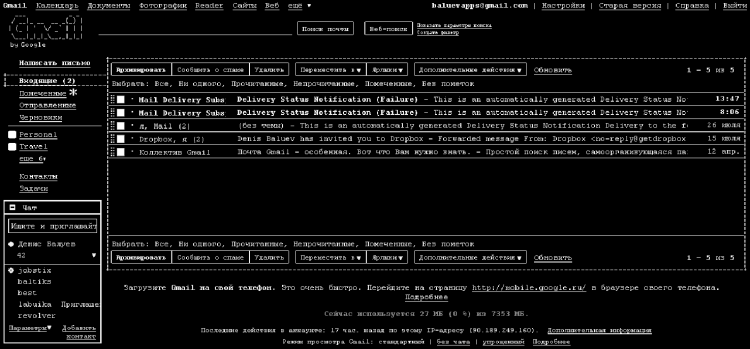 Как говорят в америках, The last but not least, т. е. «Последний по порядку, но не по значимости». Чуть не забыл о возможности доступа к Gmail с мобильного телефона! Для работы с почтой Gmail разработала специальную программу, учитывающую специфику работы маленьких телефонов с их цифровой клавиатурой, небольшим экраном и медленным gprs-соединением. Мобильный Gmail, доступный для большинства мобильных платформ, включая iPhone, запоминает список последних сообщений и поддерживает цифровые горячие клавиши (например, когда я хочу написать письмо из мобильного клиента, то просто нажимаю на клавиатуре «2»), а потому давно и надежно прописался на моей старенькой Nokia 6233. Думаю, поселится и у вас – иметь доступ к почте отовсюду, где есть мобильная связь, дорогого стоит. Для получения мобильного клиента под большинство популярных телефонных платформ (поддерживаются iPhone, Nokia, Blackberry, Symbian) зайдите браузером телефона по адресу http://mobile.google.ru.