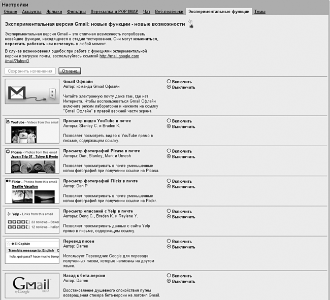 Рисунок 1.36. Это лишь малая часть экспериментальных функций Gmail. Все остальное просто не поместилось на экране