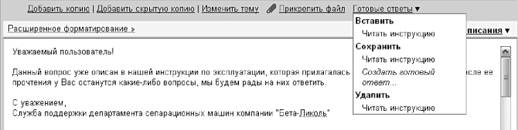 Кроме того, возможность настройки так называемых шаблонов ответов – стандартных писем вида «Прочитайте же, наконец, инструкцию! Ваш системный администратор» или «Спасибо за ваше письмо. Реклама в нашем издании стоит…». Шаблоны можно отправлять вручную или настроить их посылку на основании все тех же фильтров. Включите опцию «Шаблоны ответов» – теперь при ответе на любое письмо справа от ссылки «Прикрепить файл» появится новая ссылка «Готовые ответы». Напишите новый стандартный ответ и выберите в выпадающем меню пункт «Создать готовый ответ…». Назовите шаблон коротким запоминающимся именем – теперь его можно будет вставлять в любое ответное письмо (рис. 1.38).