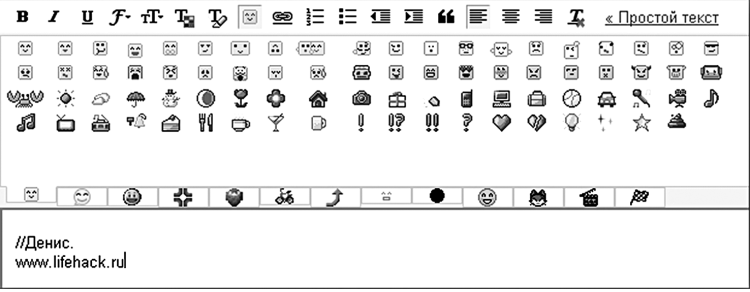 Рисунок 1.39. Список смайликов пугающе огромен – кроме физиономий различной степени веселости здесь есть крабы, разбитые сердца и даже намекающие на веселый отдых бокалы для коктейлей!