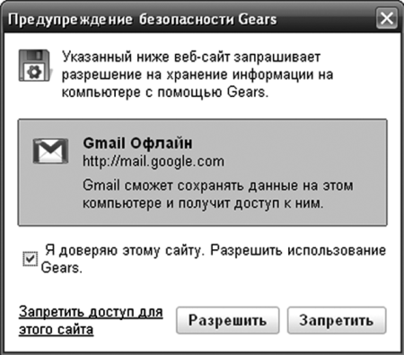 Еще чуть-чуть интересной истории. В 2007 г. компания Google представила свою технологию Gears (в переводе на вольный русский «Шестеренки»), которая позволяет работать с веб-приложениями в глубоком-глубоком офлайне, – все данные сохраняются на локальной машине и синхронизируются с сервером, как только появляется доступ в Сеть. Gears работает со многими приложениями Google, включая Gmail, и если вы хотите иметь доступ к почте в командировках (видит бог, я всегда об этом мечтал!), то нет ничего проще. Зайдите в настройки, переключитесь на закладку «Gmail Офлайн» и установите параметр «Включить Gmail Офлайн для этого компьютера». Система попросит вас об установке специального плагина для браузера – тот возьмет на себя всю черную работу по сохранению данных и их синхронизации. После его установки система спросит разрешения службе Gmail использовать Gears – на эту просьбу нужно ответить согласием, после чего начнется процесс сохранения сообщений (рис. 1.40).