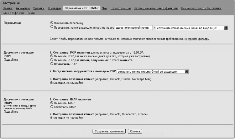 Если вы обожаете собственный почтовый клиент и ни за какие коврижки не променяете его на любые красоты веб-доступа, этот раздел настроек – для вас. Gmail позволяет организовать доступ к своей базе сообщений по протоколам POP3 и IMAP. В последнем случае можно даже создать в обычном почтовом клиенте аналог привычного веб-интерфейса Gmail: кроме сообщений будет обновляться и список ярлыков (правда, в этом случае они будут преобразованы в обычные папки). Для настройки забора почты вашим почтовым клиентом перейдите на закладку «Пересылка и POP/IMAP» и выберите один из пунктов «Включить POP для писем, полученных с этого момента», «Включить POP для всех писем» (даже для тех, которые уже загружены) или «Включить IMAP», если ваш почтовый клиент поддерживает данный протокол. Инструкция по настройке самых популярных почтовиков доступна по адресу http://b23.ru/zfa для протокола POP и http://b23.ru/zf0[3]3