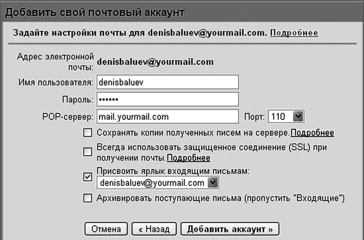 В этом случае стоит воспользоваться автоматическим сборщиком почты. Доступный через пункт «Добавить свой почтовый аккаунт» на закладке «Аккаунты» настроек, он позволяет выбрать до пяти адресов, которые Gmail будет периодически запрашивать на предмет наличия новых сообщений и закачивать себе. Вам достаточно лишь указать адрес электронной почты на другом домене, имя пользователя и пароль, а также адрес POP-сервера (все эти параметры можно просмотреть в настройках вашего старого почтового клиента, с помощью которого забиралась почта с данных адресов). При желании можно даже попросить систему автоматически назначать специальный ярлык для таких писем (рис. 1.44).