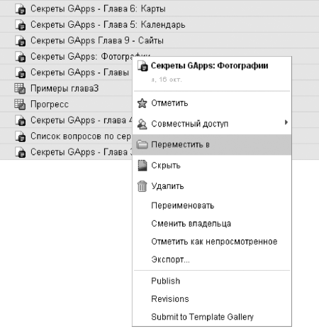 При количестве документов, приближающемся хотя бы к двум десяткам, запомнить расположение того или иного фрагмента, идеи или мысли становится делом если не безнадежным, то в плане личной эффективности весьма сомнительным. Документам нужна определенная организация – и будет гораздо лучше, если вы создадите ее с самого начала, дорабатывая и улучшая по мере роста объема данных. Разделять и властвовать разработчики предлагают нам с помощью папок. Их главное отличие от ярлыков Gmail – невозможность «положить» один документ в несколько папок. В остальном они очень схожи – папки можно раскрашивать в любимые цвета, называть любыми именами и вкладывать друг в друга, что должно обрадовать любителей построения сложных иерархий. Для переноса документа в определенную папку просто перетащите его мышкой или, щелкнув правой клавишей и вызвав контекстное меню, выберите соответствующий пункт (рис. 2.18).