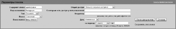 Поиск документов организован по аналогии с Gmail: достаточно ввести ключевое слово или словосочетание в строке поиска в верхней части экрана и нажать кнопку «Поиск документов» и – вуаля, список файлов, удовлетворяющих критериям, появится на экране. Если же необходимо организовать более сложный поиск по различным условиям, таким как, например, дата создания, автор или признак публикации, на помощь придет опция расширенного поиска. Нажмите ссылку «Показать параметры поиска», расположенную рядом с поисковой строкой. Для уточнения запроса доступны следующие параметры.