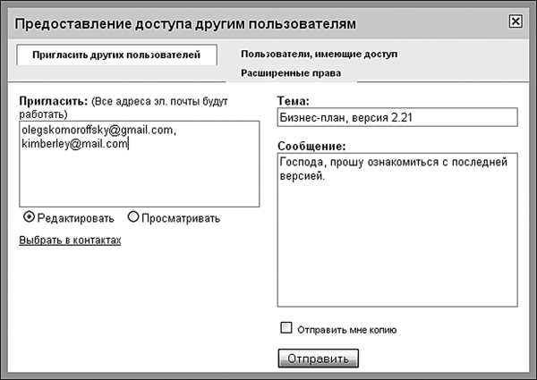 Вы сами выбираете, кем станут получатели приглашения, – соавторами с возможностью редактирования документа или просто читателями. Приглашение принять участие в работе над документом отправляется по электронной почте. Адреса получателей вводятся через запятую, а для облегчения процесса ввода сложных контактов вида olegskomoroffsky@gmail.com можно воспользоваться адресной книгой Gmail. Для этого достаточно щелкнуть по гиперссылке «Выбрать в контактах», расположенной под полем ввода адресов, и найти в появившемся окне нужное имя или заковыристый e-mail. Флажок «Соавторы могут приглашать других пользователей» определяет полномочия тех людей, кого мы пригласили для редактирования, – могут ли они в свою очередь раздавать приглашения «третьим лицам». Флажок «Приглашения может использовать кто угодно» отправляет по указанному электронному адресу ссылку, пройдя по которой читать или редактировать документ сможет любой желающий, а не только адресат. Этот параметр удобно устанавливать, если вы пока сами не знаете, кто именно будет вашим соавтором, – например, при отправке приглашения в почтовую рассылку или на форум. Несмотря на то что откликнуться на такое приглашение сможет каждый, для входа ему все равно необходимо будет воспользоваться аккаунтом Google.