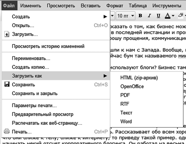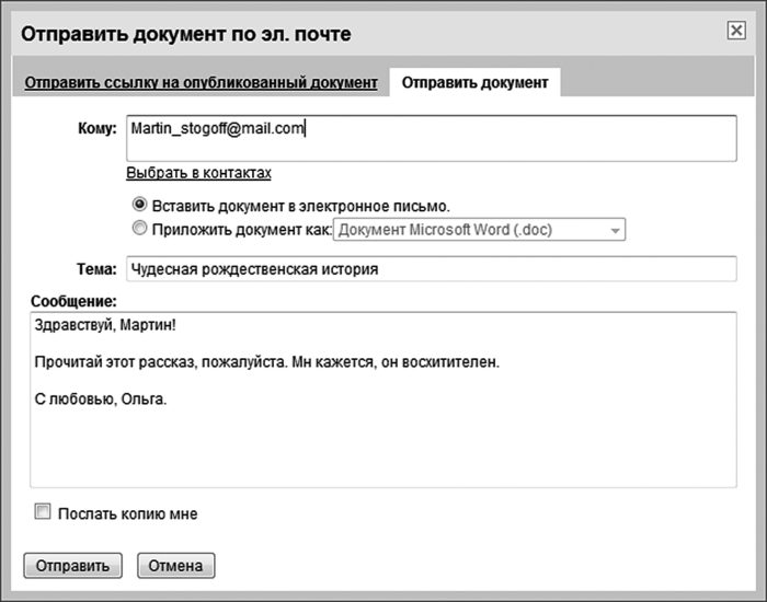 Несмотря на все преимущества совместной работы с помощью веб-интерфейса, иногда документ все же требуется переслать по электронной почте – например, человеку, по тем или иным причинам не имеющему аккаунт Google. Команда «Добавить в общие – Отправить как приложение к сообщению электронной почты» решает именно эту задачу: в появившемся окне можно выбрать почтовый адрес получателя, а также формат вложения – документ можно сохранить в виде файла MS Word, pdf, rtf или odt (OpenDocument Format) или просто вставить его текст непосредственно в тело письма (рис. 2.22).